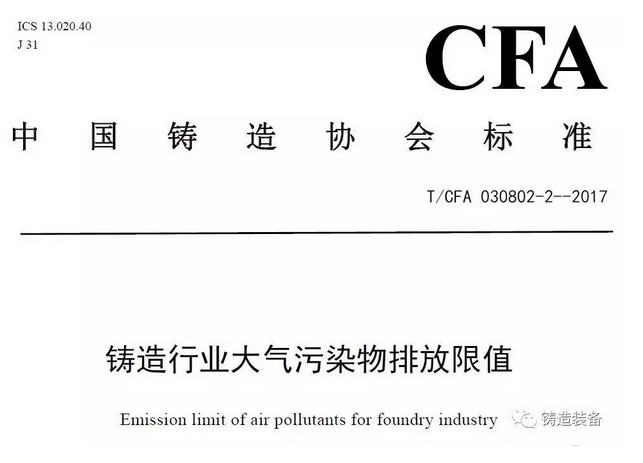 2017年7月31日,由中國(guó)鑄造協(xié)會(huì)發(fā)布的T/CFA030802-2—2017《鑄造行業(yè)大氣污染物排放限值》(中國(guó)鑄造協(xié)會(huì)標(biāo)準(zhǔn)公告 2017年 第06號(hào))發(fā)布。該標(biāo)準(zhǔn)于2017年10月1日起實(shí)施。