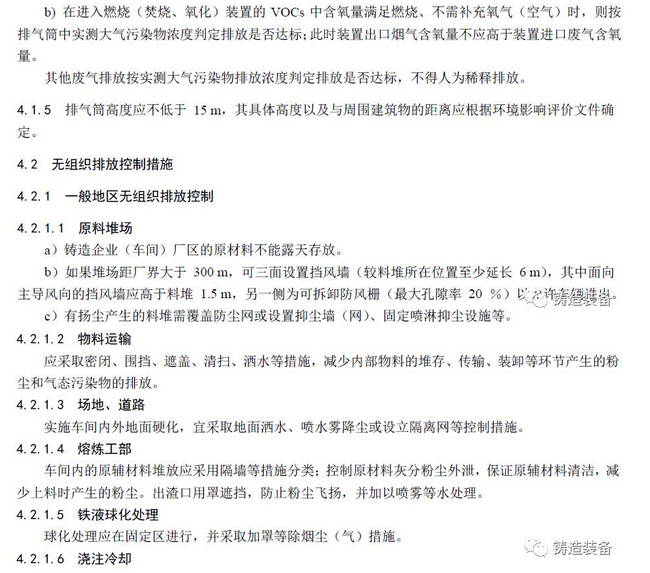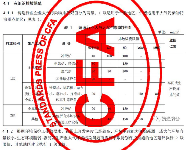 現(xiàn)摘錄T/CFA030802-2—2017中“4排放控制要求”、“5污染物監(jiān)測(cè)要求”、“6實(shí)施與監(jiān)督”部分。前三部分“1范圍、2規(guī)范性引用文件、3術(shù)語(yǔ)與定義”請(qǐng)自行登錄中國(guó)鑄造協(xié)會(huì)網(wǎng)站查閱。