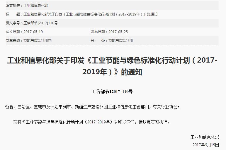 關(guān)于工信部印發(fā)《工業(yè)節(jié)能與綠色標(biāo)準(zhǔn)化行動計(jì)劃(2017-2019年)》的通知