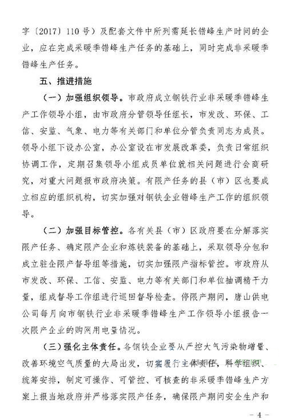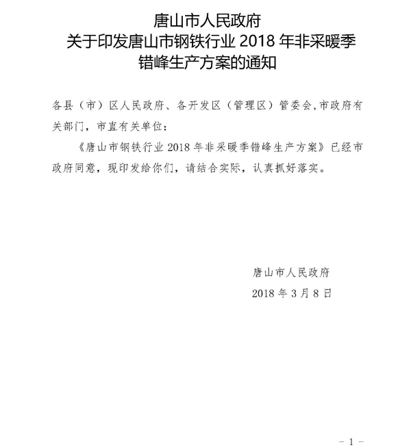 日前,《唐山市鋼鐵行業2018年非采暖季錯峰生產方案》經市政府同意,已正式下發。方案中明確了錯峰生產依據和原則,綜合考慮唐山市環境空氣質量現狀、鋼鐵企業所處區域和氣象條件,對全市鋼鐵企業實施非采暖季精準化、差異化錯峰生產。全文如下: