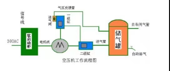 如空壓機工作流程圖所示:??? 螺桿壓縮機的工作原理可分為進氣,壓縮和排氣三個過程。隨著轉子旋轉,每對相互嚙合的齒相繼完成相同的工作循環。?