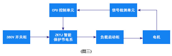 由圖三所示,在低壓380V開關柜與負載(風機水泵、空壓機、及電機拖動類)啟動柜之間串接智能保護節電系統,系統在電機的使用上,它能自動跟蹤檢測電機運行中的負載變化,將檢測信號反饋給控制中心,經過中央處理,運算放大后給出指令信號,以此來改變有功電量的輸出,使電機在最經濟的電耗下運行,達到節電的目的。